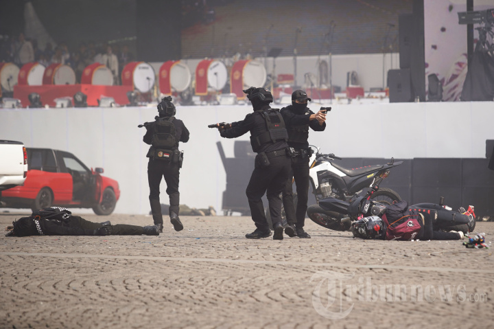Aksi beladiri dan penanganan ancaman teror prajurit TNI saat Hari Ulang Tahun (HUT) ke-79 Tentara Nasional Indonesia (TNI) di Lapangan Silang Monumen Nasional (Monas), Gambir, Jakarta Pusat, Sabtu (5/10/2024). Ada sekitar 100 ribu prajurit yang mengikuti perayaan HUT TNI ke-79 di lapangan silang Monas serta menampilkan 1.059 alutsista yang dikembangkan dari dalam negeri. Selain itu juga ada beberapa acara hiburan yang dapat disaksikan masyarakat umum. TRIBUNNEWS/HERUDIN