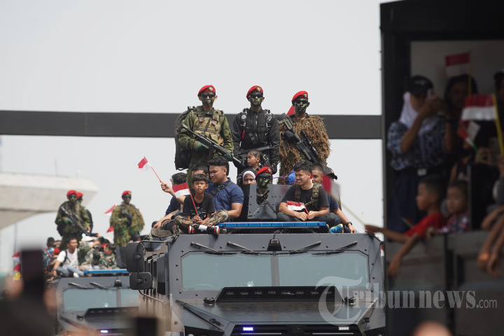 Prajurit TNI bersama warga mengikuti parade Alutsista di Silang Monas Jakarta saat Hari Ulang Tahun (HUT) ke-79 Tentara Nasional Indonesia (TNI) Sabtu (5/10/2024). Ada sekitar 100 ribu prajurit yang mengikuti perayaan HUT TNI ke-79 di lapangan silang Monas serta menampilkan 1.059 alutsista yang dikembangkan dari dalam negeri. Selain itu juga ada beberapa acara hiburan yang dapat disaksikan masyarakat umum. TRIBUNNEWS/HERUDIN
