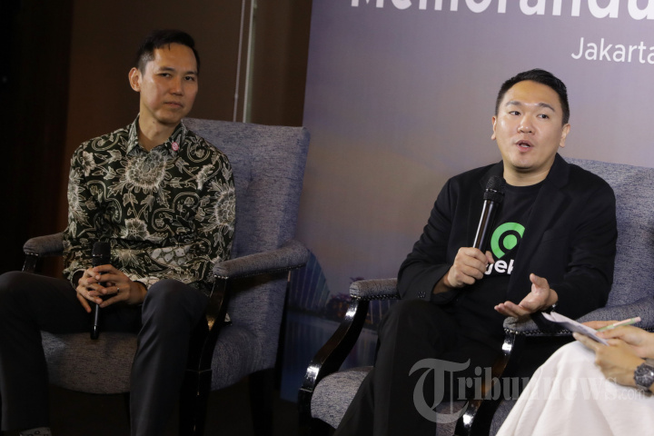 Head of Global Transport Marketing Gojek Mario Alvin (kanan) bersama Exexutive Director, Southeaat Asia of Singapore Tourism Board Terrence Voon (kiri) memberi penjelasan disela-sela penandatanganan MoU sebagai langkah awal kerja sama antara Singapore Tourism Board dan Gojek di Jakarta, Kamis (23/1/1025). Hadir di Singapura sejak 2018, layanan GoCar dari Gojek telah terintegrasi dengan layanan taksi lokal untuk mempermudah para wisatawan mengunjungi ragam destinasi wisata di Singapura. Kolaborasi ini menggabungkan basis pengguna Gojek di Indonesia yang luas dengan beragam penawaran wisata Singapura. Inisiatif bersama ini dirancang untuk memperkenalkan Singapura sebagai destinasi di mana wisatawan Indonesia dapat memaksimalkan setiap momen bersama orang tercinta - sebuah kota kecil dan dinamis dengan beragam atraksi yang mudah dijelajahi dengan Gojek. TRIBUNNEWS/IRWAN RISMAWAN