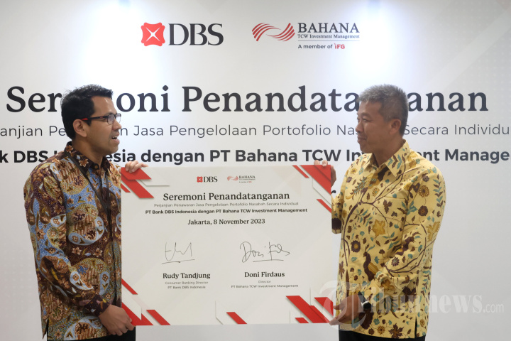 Direktur Consumer Banking PT Bank DBS Indonesia Rudy Tandjung (kanan) berbincang dengan Direktur Bahana TCW Investment Management Doni Firdaus (kiri) usai menandatangani nota kesepahaman antara Bank DBS Indonesia dan Bahana TCW Investment Management untuk menghadirkan Pengelolaan Dana Nasabah Individu (PDNI) atau Kontrak Pengelolaan Dana (KPD) di Jakarta, Rabu (8/11/2023). Melalui kerja sama ini, nasabah DBS Treasures Private Client dapat berinvestasi dalam skala global melalui Bahana TCW sebagai manajer investasi dengan perjanjian bilateral. Dana nasabah akan diinvestasikan pada beragam produk dari lembaga keuangan global yang berpengalaman sehingga nasabah dapat menikmati imbal hasil kompetitif yang dilengkapi perlindungan dan kepastian asetnya. TRIBUNNEWS/IRWAN