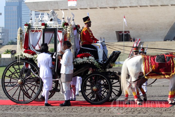 Iring-iringan pembawa duplikat bendera pusaka beserta teks Proklamasi menggunakan kereta kencana Ki Jaga Raksa berjalan Monas menuju Istana Merdeka, Jakarta, Rabu (17/8/2016). Seremoni tersebut merupakan rangkaian peringatan HUT Kemerdekaan ke-71 RI dan berbeda dari tahun-tahun sebelumnya. TRIBUNNEWS/IRWAN RISMAWAN