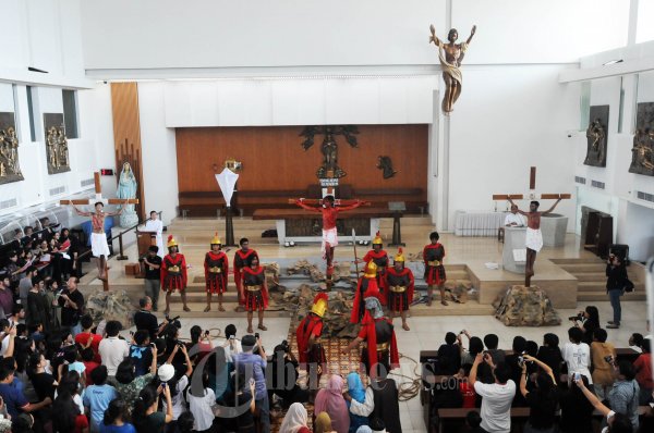 KISAH SENGSARA YESUS KRISTUS DI KAYU SALIB - Muda mudi katholik Keluarga Besar Paroki Gereja Santa Maria Regina (SANMARE) tergabung dalam Bina Iman Remaja (BIR) dan Orang Muda Katholik (OMK) melakukan drama visualisasi prosesi penyaliban Yesus, Jumat (31/3/2013) di Gereja Sanmare, Bintaro Jaya, Tangerang, Benten. Prosesi tersebut merupakan bagian dari perayaan Jumat Agung yang mengisahkan kesengsaraan Yesus Kristus untuk menebus dosa manusia dan merupakan bagian dari ibadah Paskah. Drama ini disutradarai oleh Daniel H Jacob dan penulis naskah Ariobimo Nusantara. (TRIBUNNEWS.COM/FX ISMANTO)