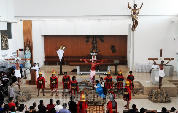 KISAH SENGSARA YESUS KRISTUS DI KAYU SALIB - Muda mudi katholik Keluarga Besar Paroki Gereja Santa Maria Regina (SANMARE) tergabung dalam Bina Iman Remaja (BIR) dan Orang Muda Katholik (OMK) melakukan drama visualisasi prosesi penyaliban Yesus, Jumat (31/3/2013) di Gereja Sanmare, Bintaro Jaya, Tangerang, Benten. Prosesi tersebut merupakan bagian dari perayaan Jumat Agung yang mengisahkan kesengsaraan Yesus Kristus untuk menebus dosa manusia dan merupakan bagian dari ibadah Paskah. Drama ini disutradarai oleh Daniel H Jacob dan penulis naskah Ariobimo Nusantara. (TRIBUNNEWS.COM/FX ISMANTO)