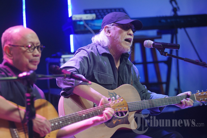 KOLABORASI DUA MAESTRO - Penampilan Iwan Fals bersama Ebiet G. Ade saat membawakan lagu karya ikonik masing-masing di Jakarta Selatan, Jumat (7/11/2025). Dua maestro musik Indonesia ini berkolaborasi menggetarkan hati pendengar dengan lagu ikonik istimewa yang sarat makna yaitu lagu Titip Rindu Buat Ayah dan lagu Ibu. Kedua karya ini menjadi persembahan mendalam tentang cinta, rindu, dan penghormatan terhadap orang tua. TRIBUNNEWS/HERUDIN