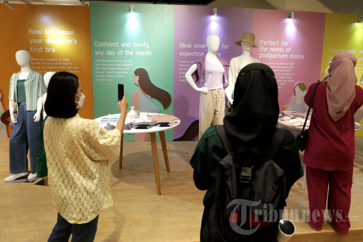 Pengunjung melihat seni instalasi koleksi innerwear dalam "Uniqlo LifeWear for Her" di Uniqlo Lippo Mall Kemang, Jakarta, Selasa (7/3/2023). Memperingati Hari Perempuan Internasional, Uniqlo mempersembahkan "LifeWear for Her" sebagai dukungan nyata untuk perempuan Indonesia dengan menciptakan innerwear yang berevolusi mengikuti fase perkembangan tubuh perempuan dari anak-anak, remaja, dewasa hingga masa menopause dan rangkaian koleksi innerwear tersebut dirangkum dalam sebuah instalasi yang ditampilkan di Uniqlo Lippo Mall Kemang mulai tanggal 3 Maret 2023. TRIBUNNEWS/IRWAN RISMAWAN