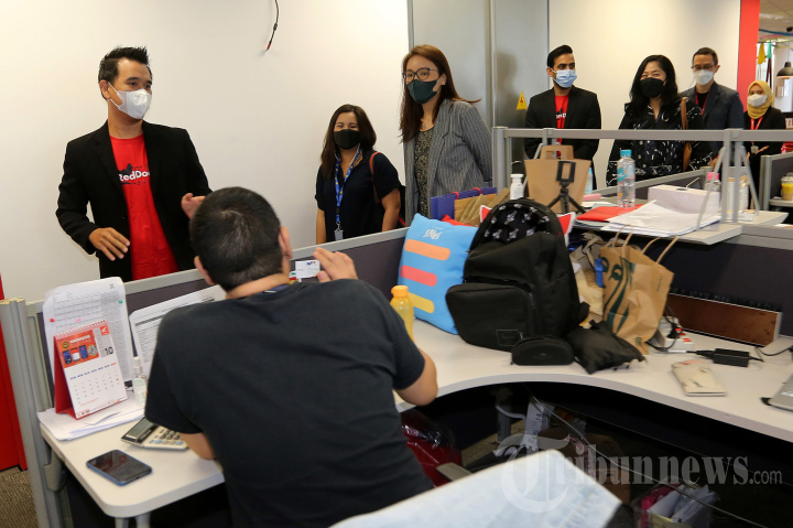 President Director RedDoorz Indonesia, Mohit Gandas (keempat kiri) bersama Head of E-Commerce RedDoorz Indonesia, Orlando Valiantino (kiri), Area Manager Chain & New Acquisition Commercial - Accommodation tiket.com, Marlina Setiawan (kedua kiri), dan Associate Market Manager Chain, Inke Jie (ketiga kiri) melakukan office tour Kantor RedDoorz di sela-sela penyerahan penghargaan bagi tiket.com di Jakarta, Senin (26/9/2022). Melalui penghargaan ini, RedDoorz memberikan apresiasi bagi tiket.com yang telah membantu perkembangan RedDoorz sejak tahun 2018 dan membantu membuka semua pintu ke destinasi wisata favorit negeri. TRIBUNNEWS/IRWAN RISMAWAN