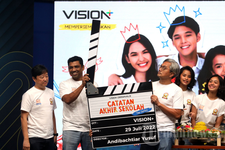 COO PT MNC OTT Network, Roy Debashis (kedua kiri) bersama Sutradara Serial "Catatan Akhir Sekolah", Andibachtiar Yusuf (kanan) disaksikan Produser Eksekutif Ideosource Entertainment, Andi Boediman (kiri) saat konferensi pers proyek kolaborasi Original Series "Catatan Akhir Sekolah" di Jakarta, Jumat (29/7/2022). Vision+ bekerja sama dengan Paragon Pictures dan Ideosource Entertainment mempersembahkan proyek kolaborasi terbaru mereka, yaitu original series yang berjudul "Catatan Akhir Sekolah". TRIBUNNEWS/IRWAN RISMAWAN