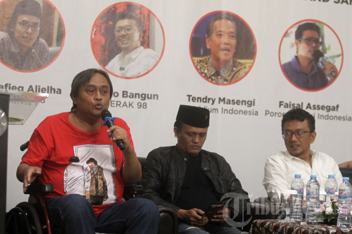 Mantan Sekjen Partai Rakyat Demokratik Petrus Haryanto memberikan pandangan terkait situasi politik di Indonesia di tengah Konsolidasi Pro Demokrasi dengan tema 'Apa Saja Boleh Beda, Musuh Kita Tetap Sama Pelanggar HAM, Politik Dinasti dan Neo Orba' di Jakarta, Minggu (21/1/2024). Konsolidasi yang diikuti oleh seluruh elemen mantan aktivis 98, diantaranya Petrus Haryanto, Azwar Furgudyama, Tendry Masengi, Parto Bangun, Syafieq Alielha, Joshua Napitupulu, Ubadillah Badrun, Antonius Danar serta perwakilan mahasiswa dari berbagai kampus di Indonesia mengajak agar mahasiswa berani turun ke jalan dalam melawan pemerintah yang melegalkan segala cara yang merusak tatanan demokrasi dengan membiarkan terjadinya Politik Dinasiti, Pelanggaran HAM serta bangkitnya Neo Orba. TRIBUNNEWS/IRWAN RISMAWAN