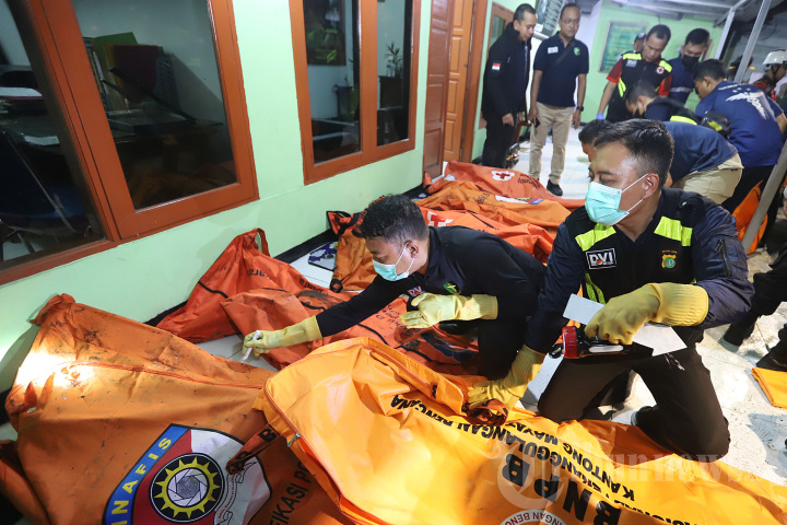 Petugas memeriksa sejumlah kantong jenazah korban kebakaran Depo Pertamina Plumpang di kawasan Jalan Koramil, Rawa Badak Selatan, Koja, Jakarta Utara, Jumat (3/3/2023) malam. Sebanyak 13 orang dilaporkan tewas akibat kebakaran hebat yang melanda Depo Pertamina Plumpang dan merembet ke permukiman di sekitarnya. TRIBUNNEWS/JEPRIMA