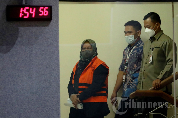 Bupati Kabupaten Bogor Ade Yasin mengenaian rompi tahanan usai menjalani pemeriksaan di Gedung KPK, Jakarta, Kamis (28/4/2022) dinihari, pasca tertangkap tangan pada Rabu (27/4/2022) dini hari. KPK menahan Bupati Kabupaten Bogor Ade Yasin dan tujuh tersangka lainnya yang terdiri dari ASN Pemkab Bogor dan Pegawai BPK Jawa Barat yang terjaring operasi tangkap tangan (OTT) dengan barang bukti Rp 1,024 miliar terkait suap pengurusan laporan keuangan Pemerintah Daerah Kabupaten Bogor tahun anggaran 2021. TRIBUNNEWS/IRWAN RISMAWAN