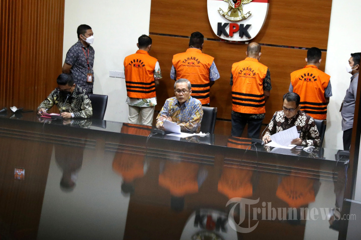 Wakil Ketua KPK Alexander Marwata menunjukkan sejumlah tersangka kasus dugaan korupsi pada Dinas Pekerjaan Umum dan Tata Ruang (PUTR) Pemerintah Provinsi Sulawesi Selatan 2019 - 2020 saat konferensi pers di Gedung KPK, Jakarta, Kamis (18/8/2022). KPK menahan Kepala Perwakilan BPK Sulawesi Tenggara / Mantan Kasuauditorat Sulsel I BPK Perwakilan Provinsi Sulawesi Selatan (Sulsel) Andi Sonny, dan 3 orang Pemeriksa pada BPK Perwakilan Provinsi Sulsel yaitu Yohanes Binur Haryanto Manik, Wahid Ikhsan Wahyudin serta Gilang Gumilar terkait kasus dugaan korupsi pada Dinas Pekerjaan Umum dan Tata Ruang (PUTR) Pemerintah Provinsi Sulawesi Selatan 2019 - 2020. TRIBUNNEWS/IRWAN RISMAWAN