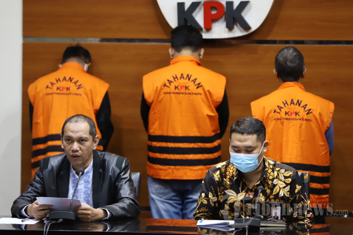 Wakil Ketua Komisi Pemberantasan Korupsi (KPK) Nurul Ghufron didampingi pejabat terkait saat menggelar konferensi pers kasus suap proses penerimaan mahasiswa baru jalur mandiri Unila dengan menghadirkan tersangka di Gedung Merah Putih Komisi Pemberantasan Korupsi (KPK), Kuningan, Jakarta Selatan, Minggu (21/8/2022). KPK menghadirkan 4 orang tersangka yang tertangkap di wilayah Lampung, Bandung dan Bali diantaranya Rektor Universitas Lampung periode 2020 s/d 2024 KRM, Wakil Rektor I Bidang Akademik Universitas Lampung HY, Ketua Senat Universitas Lampung MB dan Swasta AD usai menindaklanjuti laporan masyarakat yang diterima KPK terkait dengan dugaan korupsi pada penerimaan mahasiswa di Universitas Lampung tahun 2022. Tribunnews/Jeprima