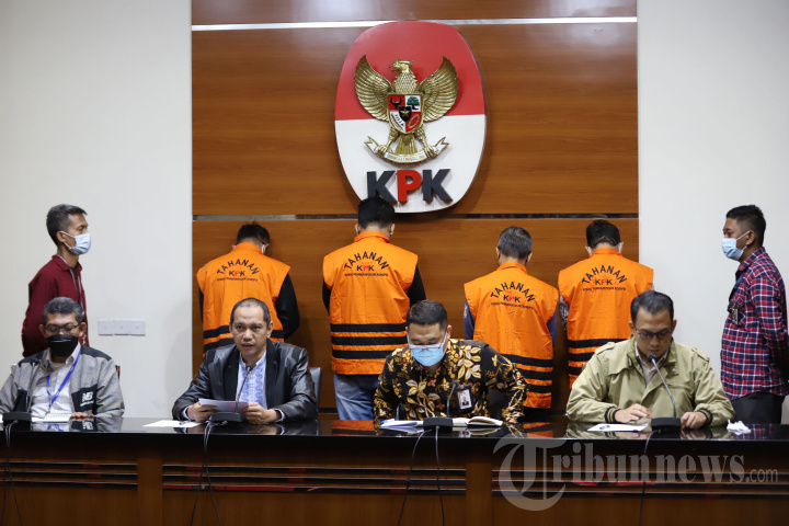 Wakil Ketua Komisi Pemberantasan Korupsi (KPK) Nurul Ghufron didampingi pejabat terkait saat menggelar konferensi pers kasus suap proses penerimaan mahasiswa baru jalur mandiri Unila dengan menghadirkan tersangka di Gedung Merah Putih Komisi Pemberantasan Korupsi (KPK), Kuningan, Jakarta Selatan, Minggu (21/8/2022). KPK menghadirkan 4 orang tersangka yang tertangkap di wilayah Lampung, Bandung dan Bali diantaranya Rektor Universitas Lampung periode 2020 s/d 2024 KRM, Wakil Rektor I Bidang Akademik Universitas Lampung HY, Ketua Senat Universitas Lampung MB dan Swasta AD usai menindaklanjuti laporan masyarakat yang diterima KPK terkait dengan dugaan korupsi pada penerimaan mahasiswa di Universitas Lampung tahun 2022. Tribunnews/Jeprima