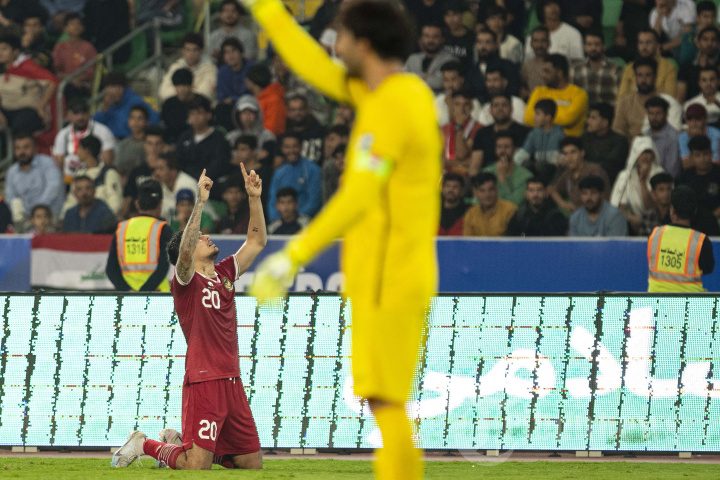 Bek Indonesia Shayne Pattynama merayakan gol pertama timnya pada pertandingan sepak bola kualifikasi AFC Piala Dunia FIFA 2026 antara Irak dan Indonesia di Stadion Internasional Basra pada 16 November 2023. (Photo by Hussein Faleh / AFP)
