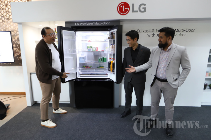 KULKAS LG - Product Director Kitchen Hme Appliance Solution LG Indonesia, Jungsoo An (tengah) bersama Corporate Marketing Manager of LG Indonesia, Dedi Triono (kanan), dan Head of PM Kitchen Home Appliance Solution of LG Indonesia, Rumbi saat peluncuran kulkas LG InstaView Multi-Door dengan Auto Ice Maker di Jakarta, Selasa (10/2/2026). PT LG Electronics Indonesia (LG) meluncurkan inovasi terbaru pada lini perangkat rumah tangga kelas atas, yaitu kulkas LG InstaView Multi-Door dengan Auto Ice Maker. Kulkas premium berkapasitas ekstra lega hingga 612 liter ini dirancang khusus untuk memenuhi kebutuhan penyimpanan nutrisi keluarga modern di Indonesia. TRIBUNNEWS/HERUDIN