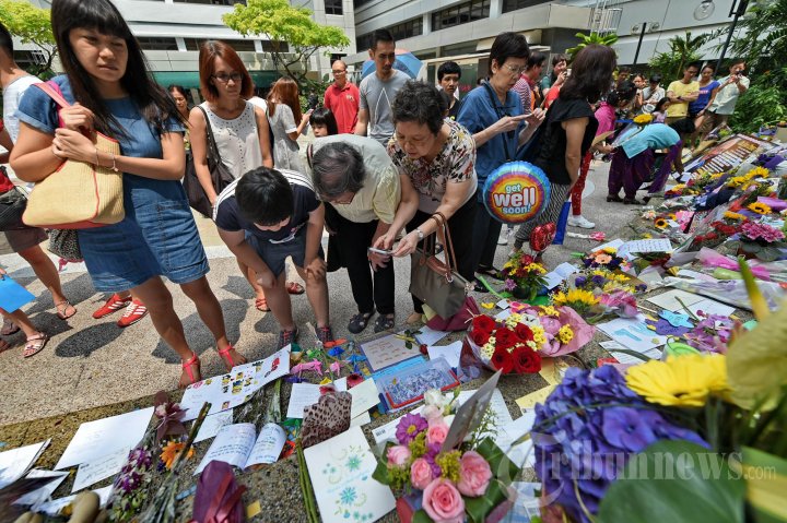 Warga meletakkan karangan bunga dan tulisan penghormatan untuk mantan Perdana Menteri Singapura, Lee Kuan Yew, di depan Singapore General Hospital, Minggu (21/3/2015). Lee Kuan Yew menghembuskan nafas terakhir di usianya yang telah menginjak 91 tahun akibat penyakit pneumonia. Kondisi Lee Kuan Yew dikabarkan terus menurun sejak dirawat di rumah sakit pada 5 Februari 2015 lalu. AFP PHOTO / Roslan Rahman