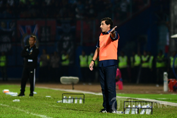 Pelatih kepala Arema FC, Eduardo Almeida memberikan instruksi kepada pemainnya dari pinggir lapangan dalam laga lanjutan Liga 1 2022/2023 antara Arema FC melawan PSS Sleman di Stadion Kanjuruhan, Kabupaten Malang, Jawa Timur, Jumat (5/8/2022) malam. Arema FC ditahan imbang PSS Sleman dengan skor 0-0. SURYA/PURWANTO