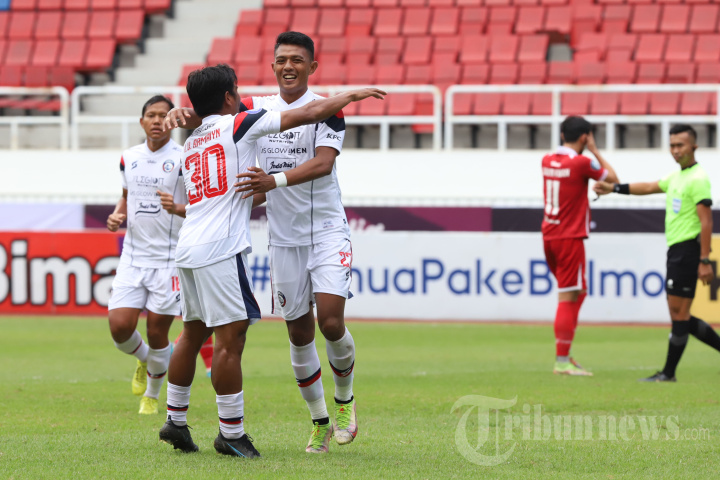 Selebrasi pemain Arema Dedik S bersama rekannya usai mencetak gol kegawang Persis Solo pada pertandingan Liga 1 di Stadion Jatidiri, Semarang, Jawa Tengah, Minggu (11/12/2022). Pertandingan pada babak pertama hasil skor kedua tim 1-1. Tribunnews/Jeprima