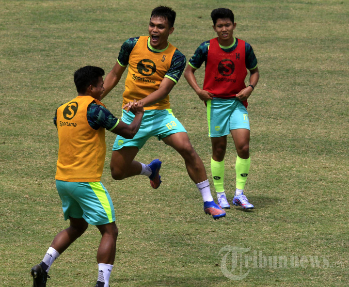 Pesepak bola Persib Bandung, Rachmat Irianto (tengah) kegirangan setelah tim rompi kuning memenangkan permainan saat mengikuti sesi latihan di Stadion Sidolig, Kota Bandung, Jawa Barat, Senin (3/10/2022). Tim Persib Bandung tetap menggelar latihan rutin meskipun pertandingan Liga 1 mengalami penundaan buntut tragedi di Stadion Kanjuruhan, Kabupaten Malang. TRIBUN JABAR/DENI DENASWARA
