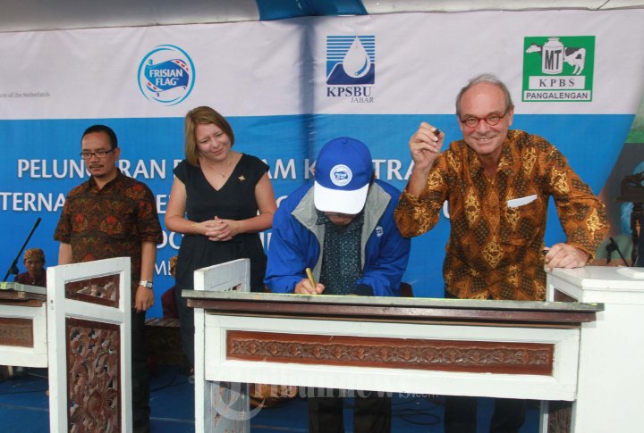PROGRAM KEMITRAAN - Presdir Frisian Flag Indonesia, Marco Spits didampingi, secara resmi melakukan Peluncuran Program Kemitraan Peternak Sapi Perah di Desa Cibodas, Kecamatan Lembang, Kabupaten Bandung Barat, Rabu (3/7/2013) yang ditandai dengan pemecahan kendi dan toast botol susu. Program kemitraanyang berlangsung untuk kurun waktu 2013-2017 dengan total dana 10 Juta Euro (Rp 130 Miliar), yang berasal dari pemerintah Belanda sebesar 4 Juta Euro (Rp 52 Miliar), dari FFI dan koperasi sebesar 6 Juta Euro (Rp 78 Miliar), program ini bertujuan untuk meningkatkan kesejahteraan lebih dari 10 ribu peternak sapi perah si Pangalengan dan Lembang. (Warta Kota/nur ichsan)