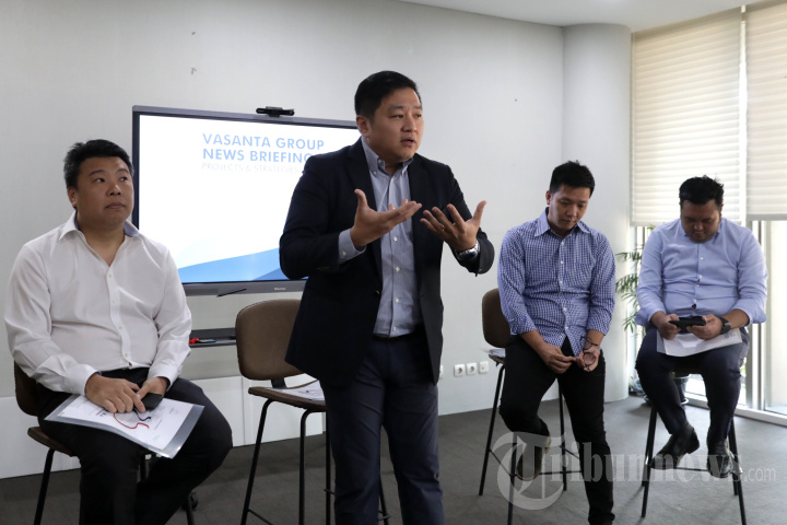 CEO Vasanta Group Nicholas Hum (kedua kiri) bersama Chairman Vasanta Group Agnus Suryadi (kiri), Executive Director Vasanta Group Erick Wihardja (kedua kanan) dan Executive Director Vasanta Group Denny Asalim (kanan) memberi paparan saat Vasanta Group News Briefing : Projects & Strategies di Alam Sutera, Tangerang, Banten, Selasa (12/9/2023). Vasanta Group berkomitmen untuk menghadirkan properti terbaik sebagai wujud kontribusi di industri sekaligus menghadapi tantangan pasar di Indonesia dan Selain menampilkan ragam proyek yang sedang digarap serta strategi investasi, dalam kesempatan ini Vasanta Group juga memperkenalkan empat punggawanya yang visioner dan inovatif di ranah bisnis properti. TRIBUNNEWS/IRWAN RISMAWAN