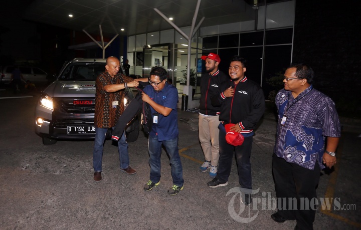 Direktur Group of Regional Newspaper Herman Darmo (kiri) didampingi After Sales Service Division Head Astra Isuzu Heri Wasesa (kanan) menyematkan jaket dan topi melepas tim Liputan Jalur Mudik Tour de Java dengan mobil Isuzu MU-X di halaman Redaksi Tribun, Palmerah, Jakarta Pusat, Jumat (2/6/2017). Selain menyisir jalur mudik di Pulau Jawa, Tim Tribun juga menyusuri Pulau Sumatera dari Lampung hingga Nanggroe Aceh Darussalam. (Tribunnews/Ade Mayasanto)