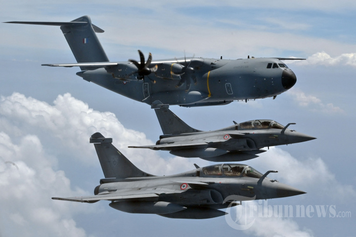 Pesawat tempur multirole Dassault Rafale dan pesawat angkut Airbus A400M terbang dalam formasi selama penerbangan demonstrasi oleh Angkatan Udara Prancis di atas Selat Sunda Indonesia pada 12 September 2022. - Indonesia pada Februari 2022 menandatangani kesepakatan dengan Prancis untuk membeli enam pesawat tempur Rafale sebagai bagian dari total pesanan 42 yang diantisipasi, karena Paris memperkuat hubungan militer di Asia-Pasifik. (Photo by ADEK BERRY / AFP)