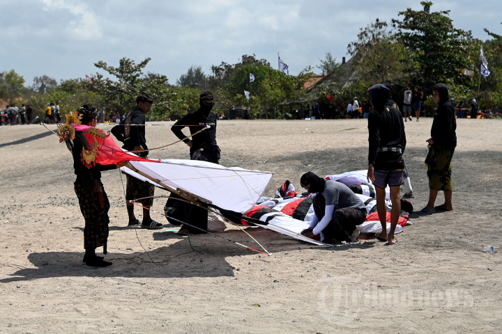 Orang-orang bersiap untuk menerbangkan layang-layang mereka selama Festival Layang-layang di pantai Mertasari di Sanur di pulau resor Indonesia Bali pada 31 Juli 2022. (Photo by SONNY TUMBELAKA / AFP)