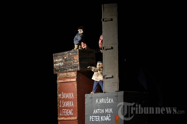 Foto yang diambil pada tanggal 8 Oktober 2022 ini menunjukkan seorang seniman dari Divadlo Houze menampilkan Kembalinya Ondrej Balaz atau Gambar dari Perang Besar selama International Biennale Puppet Festival 2022 di Yogyakarta. (Photo by Adek BERRY / AFP)