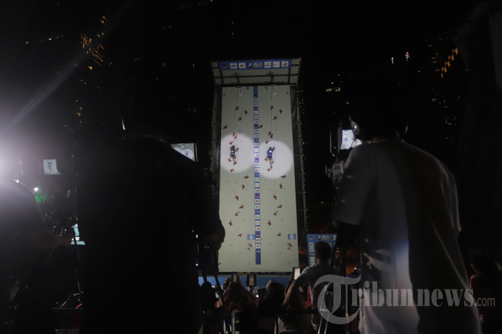 Atlet panjat tebing beradu cepat pada pertandingan Piala Dunia Panjat Tebing IFSC 2022 kategori speed di Jakarta, Sabtu (24/9/2022). Gelaran bergengsi panjat tebing yang mempertandingkan dua kategori speed dan lead tersebut berlangsung selama tiga hari dari Sabtu (24/9/2022) hingga Senin (26/9/2022) diikuti 200 atlet dari 27 negara. TRIBUNNEWS/HERUDIN