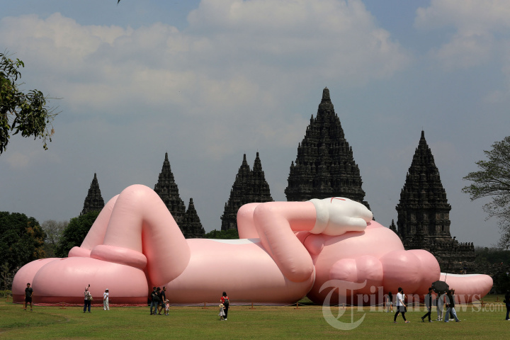 Orang-orang melihat instalasi seni yang dibuat oleh seniman Amerika Brian Donnelly, juga dikenal sebagai Kaws, di Candi Prambanan, salah satu candi Hindu terbesar di Asia Tenggara dan Warisan Dunia UNESCO, di Yogyakarta pada 19 Agustus 2023. (Photo by DEVI RAHMAN / AFP)