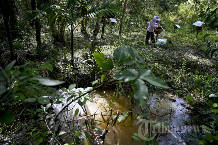 Seorang peternak lebah mengumpulkan madu dari sarang lebah yang tidak bersengat di sebuah peternakan lebah di Blang Bintang, provinsi Aceh, Indonesia pada 13 September 2022. (Photo by Chaideer MAHYUDDIN / AFP)