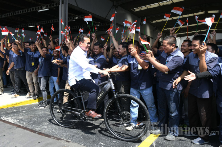Menteri Perdagangan Indonesia Budi Santoso (baju putih) berkeliling dengan sepeda dan menyapa karyawan PT Insera Sena Sidoarjo, Selasa (3/12/2024). PT Insera Sena melakukan ekspor perdana ke Amerika melalui produk E-Bike Polygon dengan baterai dalam negeri. SURYA/HABIBUR ROHMAN)
