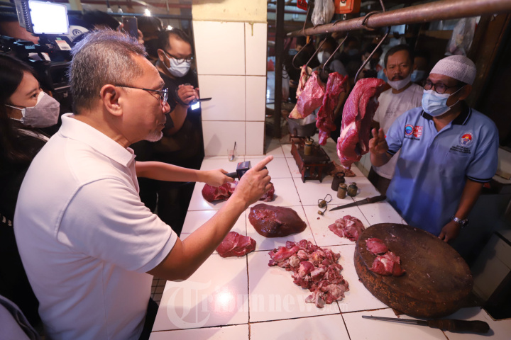 Menteri Perdagangan Zulkifli Hasan meninjau sejumlah titik penjualan minyak goreng curah rakyat (MGCR), telur dan daging yang berada di Pasar Kramat Jati, Jakarta Timur, Sabtu,(25/6/2022). Pada kesempatan tersebut Mendag juga menyempatkan meninjau stock point minyak goreng curah rakyat yang disediakan oleh PT Perusahaan Perdagangan Indonesia Member Of ID Food bekerja sama dengan Pasar Jaya di Pasar Kramat Jati, Jakarta Timur. Tribunnews/Jeprima