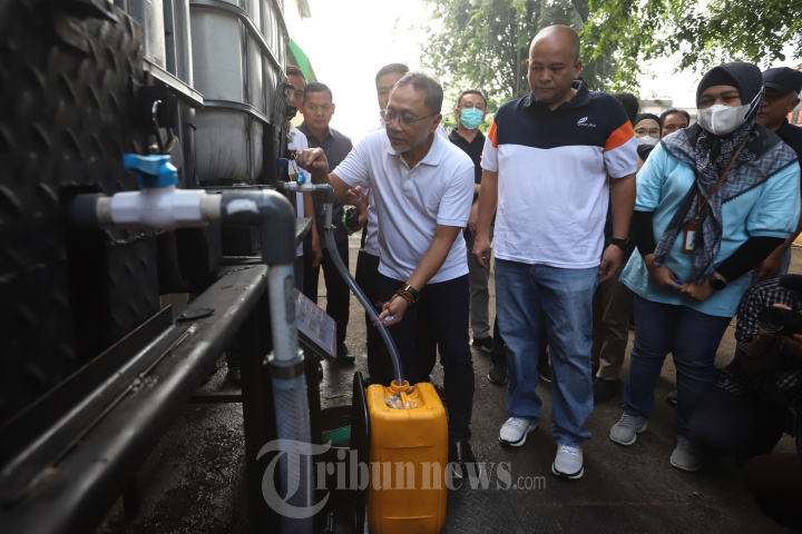 Menteri Perdagangan Zulkifli Hasan meninjau sejumlah titik penjualan minyak goreng curah rakyat (MGCR), telur dan daging yang berada di Pasar Kramat Jati, Jakarta Timur, Sabtu,(25/6/2022). Pada kesempatan tersebut Mendag juga menyempatkan meninjau stock point minyak goreng curah rakyat yang disediakan oleh PT Perusahaan Perdagangan Indonesia Member Of ID Food bekerja sama dengan Pasar Jaya di Pasar Kramat Jati, Jakarta Timur. Tribunnews/Jeprima