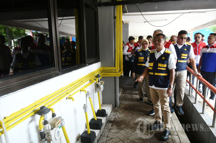 JARINGAN GAS - Menteri Energi dan Sumber Daya Manusia (ESDM) Bahlil Lahadalia meninjau pasokan jaringan gas (jargas) PGN di Rusun Grudo Surabaya , Selasa (225/3/2025). Ketersedian Bahan Bakar Minyak (BBM) dan LPG di wilayah Jawa Timur (Jatim) dalam kondisi aman. Dengan ketersedian BBM, baik jenis Pertalite, Pertamax, Pertamax, Pertamax Turbo, Pertamax Dex, Dexlite dan Bio Solar, dengan cadangan hingga untuk 15 hari kedepan. (SURYA/HABIBUR ROHMAN)