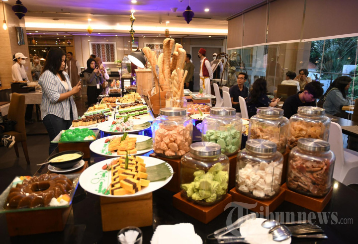 PADUAN TIMUR TENGAH - Pengunjung menikmati aneka menu berbuka puasa di Hotel Santika Premiere Gubeng Surabaya, Kamis *14/3/2024). Pada Ramadhan 1445 H tahun ini Hotel Santika Premiere Gubeng Surabaya melalui The Travelodge Restaurant memberikan kebebasan bagi pengunjung maupun tamu hotel untuk menikmati beraneka sajian menu berbuka dengan berbagai pilihan, diantaranya Menu Tradisional dan menu ala Timur Tengah. (SURYA/HABIBUR ROHMAN)