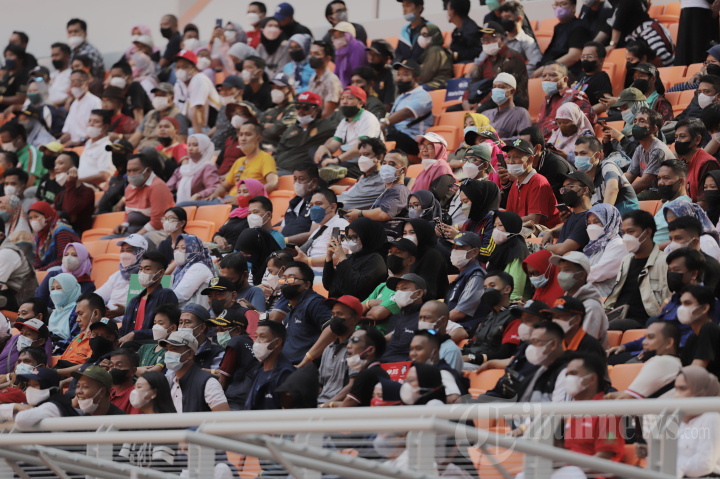 Penonton yang merupakan undangan menyaksikan pertandingan International Youth Championship (IYC) di Jakarta International Stadium (JIS), Jakarta Utara, Jumat (15/4/2022). Stadion megah milik warga Jakarta berkapasitas 82 ribu penonton ini digunakan perdana dengan menghadirkan penonton secara terbatas. TRIBUNNEWS/HERUDIN