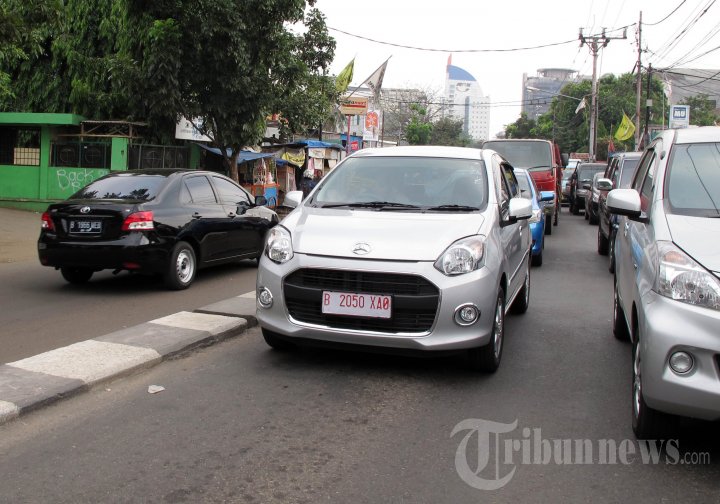 Mobil murah atau Low Cost Green Car (LCGC), Daihatsu Ayla melintas di Jalan Ciputat Raya, Pondok Pinang, Jakarta Selatan, Jumat (27/9/2013). Untuk membendung lonjakan mobil murah di jalan raya, Pemprov DKI Jakarta telah menyiapkan berbagai jurus, di antaranya rencana pengenaan tarif parkir tinggi dan jalan berbayar. (Warta Kota/Alex Suban)