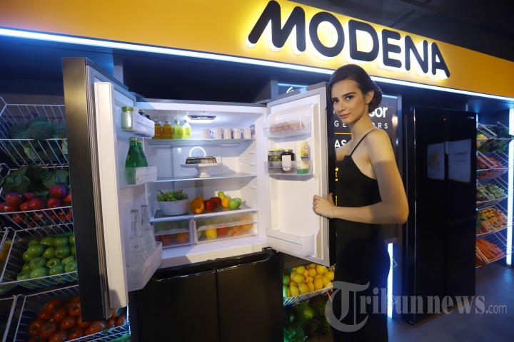 Model berpose di dekat lemari es Modena Smart Sensor Refrigerators, di Jakarta, Kamis (22/8/2019). PT Modena Indonesia mengenalkan lima produk lemari es berteknologi Smart Sensor Refrigerators yang dijual mulai dari Rp 10 juta hingga Rp 20 jutaan. Tribunnews/Herudin