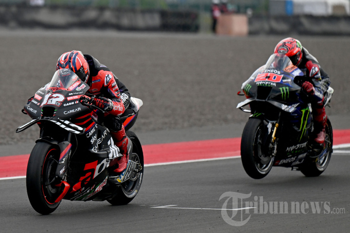 Pembalap Monster Energy Yamaha MotoGP Prancis Fabio Quartararo (kanan) dan pebalap Aprilia asal Spanyol Maverick Vinales berlaga pada Grand Prix MotoGP Indonesia di Sirkuit Internasional Mandalika di Kuta Mandalika, Lombok Tengah pada 15 Oktober 2023. (Photo by SONNY TUMBELAKA / AFP)
