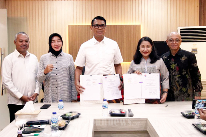 Senior Director & General Manager Herbalife Indonesia, Andam Dewi dan Deputi Bidang Pembudayaan Olahraga Kementerian Pemuda dan Olahraga Republik Indonesia (Kemenpora RI) Rudy Sufahriadi didampingi oleh Director of Government Affairs Herbalife Indonesia Arif Mustolih, Asisten Deputi Olahraga Masyarakat Kemenpora RI Suryati dan Sekretaris Deputi Bidang Pembudayaan Olahraga, Suyadi Prawiro berfoto seusai penandatanganan kemitraan untuk mencapai target nasional - Indonesia Sehat & Bugar - pada tahun 2045 di Kantor Kementerian Pemuda dan Olahraga Indonesia, Senayan, Jakarta, Selasa (17/10/2023). Dengan kemitraan ini, Herbalife dan Kemenpora RI berkomitmen untuk bekerja sama dalam memberikan edukasi kepada masyarakat mengenai gaya hidup sehat dan aktif serta mengajak seluruh lapisan masyarakat untuk gemar berolahraga melalui berbagai kegiatan olahraga dengan komunitas, program pendidikan nutrisi dan kesehatan. Selain itu juga bekerjasama menyediakan infrastruktur dan fasilitas yang diperlukan untuk merangkul gaya hidup yang lebih aktif guna menuju Indonesia Bugar 2045. Tribunnews/Jeprima