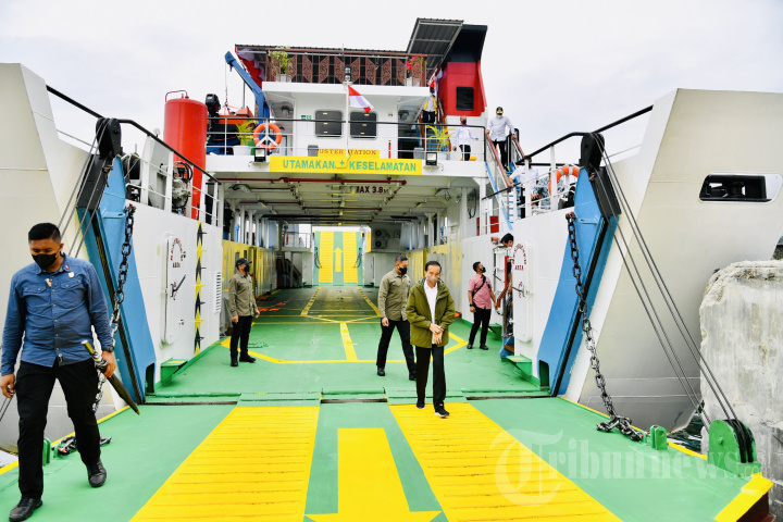 Presiden Joko Widodo dan rombongan tiba di dermaga Pelabuhan Ambarita, Kabupaten Samosir, usai menyeberangi Danau Toba dengan menaiki kapal feri KMP Kaldera Toba yang berangkat dari Pelabuhan Ajibata, Kabupaten Toba, Sumatera Utara, Rabu (2/2/2022). Sebelumnya, Presiden Jokowi meresmikan tujuh pelabuhan penyeberangan dan empat kapal motor penumpang (KMP) di kawasan dermaga Pelabuhan Ajibata. Di antara yang diresmikan itu adalah Pelabuhan Ajibata dan KMP Kaldera Toba. Tribunnews/HO/Biro Pers Setpres/Laily Rachev