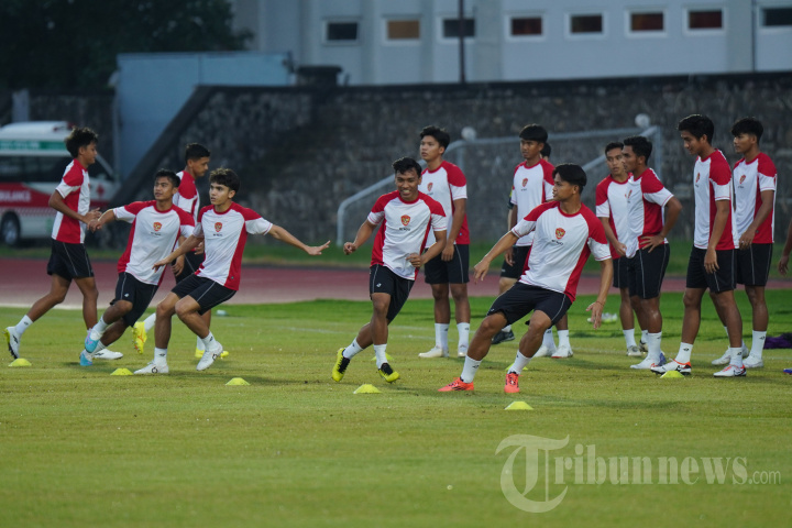 Pesepak bola Timnas Indonesia, Hokky Caraka, Arkhan Fikri, Nathan Dethan, dan Pratama Arhan (depan, dari kanan ke kiri) melakukan official training di Stadion Sriwedari, Solo, Rabu (11/12/2024) sore. Timnas Indonesia akan menghadapi Laos pada laga kedua penyisihan grup B Piala AFF 2024 sebagai tuan rumah. TRIBUNNEWS/Muhammad Nursina