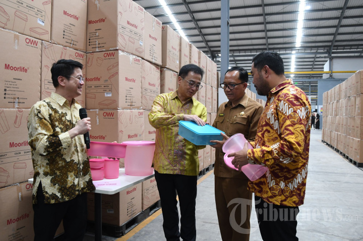 PABRIK MOORLIFE TERBESAR - Founder & President Moorlife Herman Tanoko (tiga kanan) pada peresmian dan dibukanya pabrik terbesar Moorlife di Indonesia di Nganjuk Jawa Timur, Senin (4/12/2023). Pabrik Moorlife Nganjuk saat ini dibangun diatas lahan seluas 3,5 ha dengan menargetkan setiap bulannya mampu memproduksi hingga 800 ton 'plasticware' melalui 60 mesin yang dioperasikan 350 pekerja. (SURYA/Habibur Rohman)