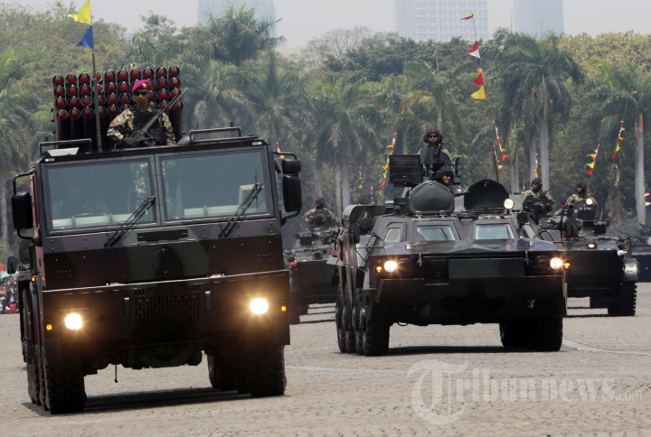 Prajurit TNI melakukan parade alutsista saat upacara Hari Ulang Tahun (HUT) ke-78 Tentara Nasional Indonesia (TNI) di Lapangan Silang Monumen Nasional (Monas), Gambir, Jakarta, Kamis (5/10/2023). HUT ke-78 TNI tersebut mengangkat tema TNI Patriot NKRI: Pengawal Demokrasi untuk Indonesia Maju. TRIBUNNEWS/IRWAN RISMAWAN
