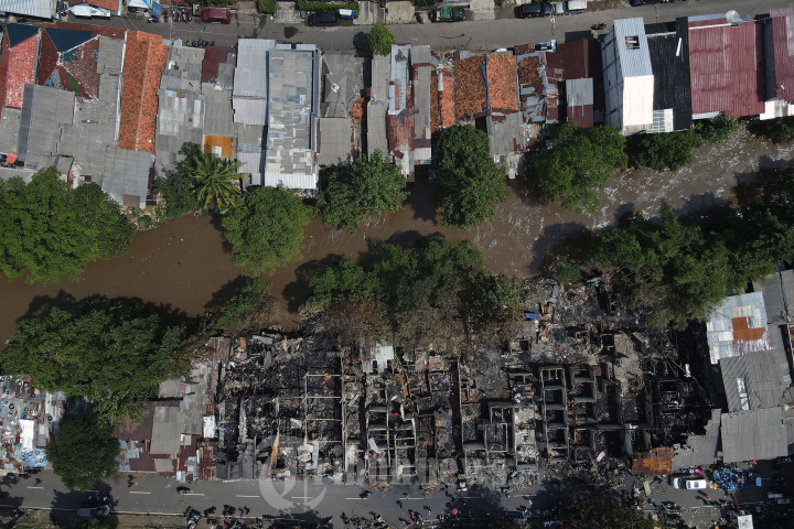 Foto udara lokasi kebakaran pemukiman di kawasan manggarai, Jakarta, Minggu (18/12/2022). Kebakaran yang terjadi pada Sabtu (17/12/2022) kemarin menghanguskan sekitar 50 rumah semi permanen yang ada di bantaran sungai Ciliwung. TRIBUNNEWS/IRWAN RISMAWAN