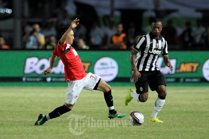 Pemain Juventus, Patrice Evra (kanan) berebut bola dengan pemain Indonesia Super League (ISL) All Stars, Matsunaga Shohei (kiri) dalam pertandingan persahabatan di Stadion Utama Gelora Bung Karno (SUGBK), Jakarta Pusat, Rabu (6/8/2014). Juventus FC menang atas ISL All Stars dengan skor 8-1. (Super Ball/Feri Setiawan)