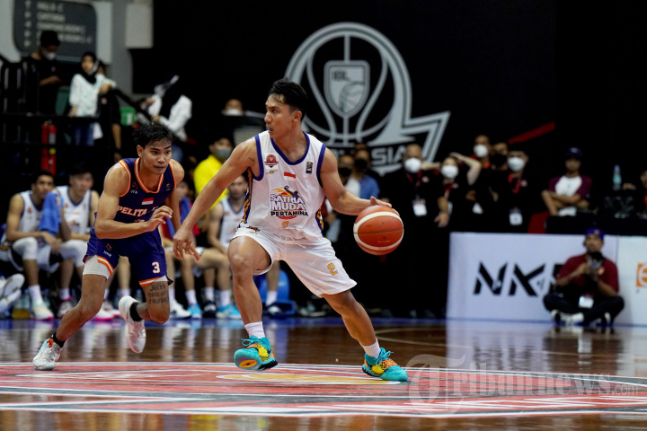 Pebasket Satria Muda, Hardianus (kanan) hendak melewati adangan pebasket Pelita Jaya, Yesaya Alessandro Saudale dalam final IBL Indonesia Cup 2022 antara Satria Muda vs Pelita Jaya di Sritex Arena Solo, Minggu (13/11/2022) sore. Pelita Jaya sukses mengalahkan Satria Muda dengan perelahn poin 70-62. TRIBUNNEWS/MUHAMMAD NURSINA