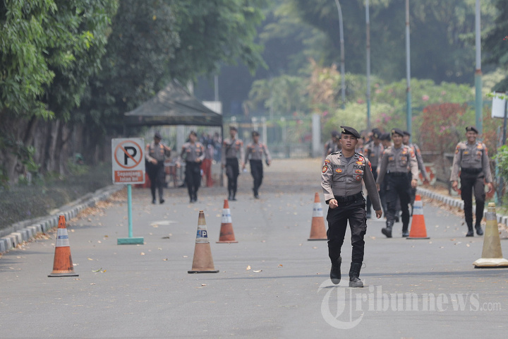 Sejumlah anggota polisi berjaga di depan Hotel Sultan, Kompleks GBK, Jakarta, Rabu (4/10/2023). Pusat Pengelolaan Kompleks Gelora Bung Karno (PPKGBK) memasang spanduk pemberitahuan tanah aset negara di Hotel Sultan, dan mengingatkan pengelola hotel itu segera mengosongkan lahan di Blok 15 kawasan GBK. Tribunnews/Jeprima